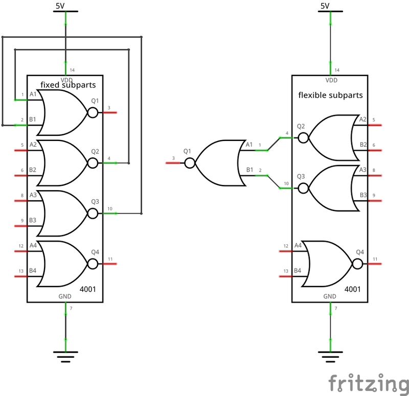 Subparts can be used to clean up the schematic view. This example shows a 4001 Logic IC.