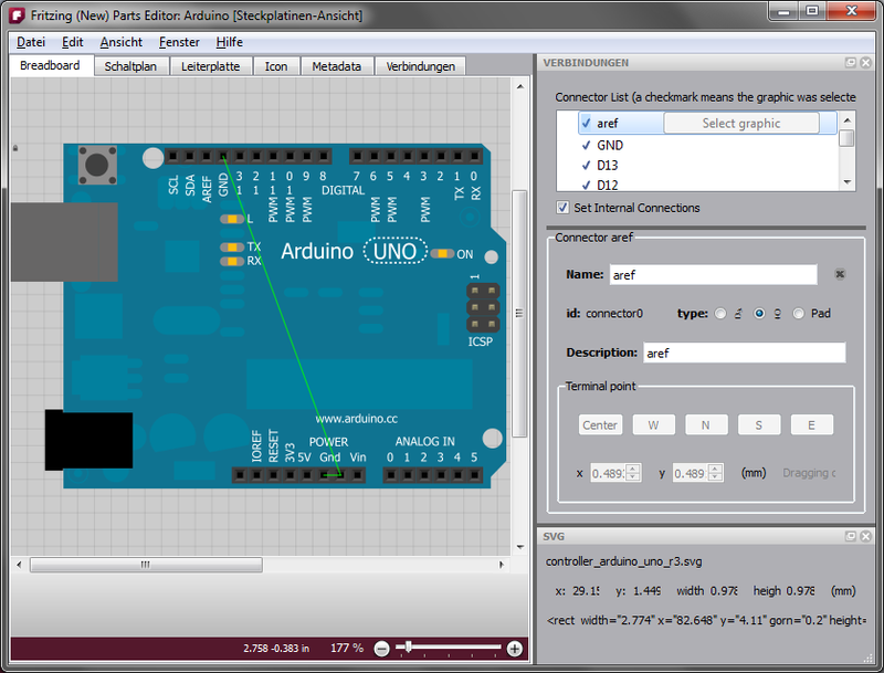 An internal connection is when a two or more connectors in a part are already connected, for example the GND connectors on the Arduino UNO. You can specify and edit internal connections by clicking on the “Set internal connections” checkbox in the Connectors widget–it’s beneath the connectors list (you can see it in the image of the Connectors widget, above). Since we are talking about the Arduino UNO, here is what it looks like when Set internal connections is checked: