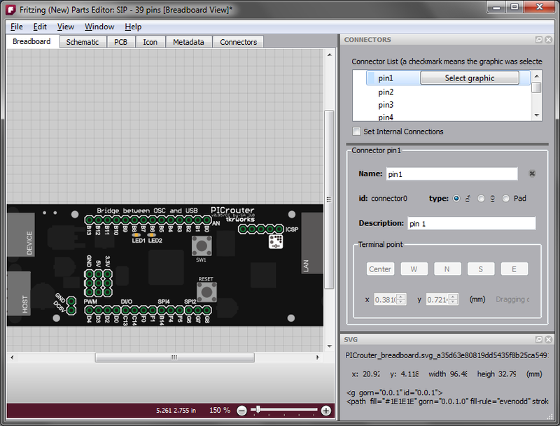 In PCB and Breadboard view the terminal point is usually the center of the connector so you don’t have to do any thing else.  But in schematic view the terminal point is usually near the end of the connector. So let’s go to schematic view.  We start with the original SVG image. Note how the connectors are already showing their anchor points. Pin3 is the current connector.