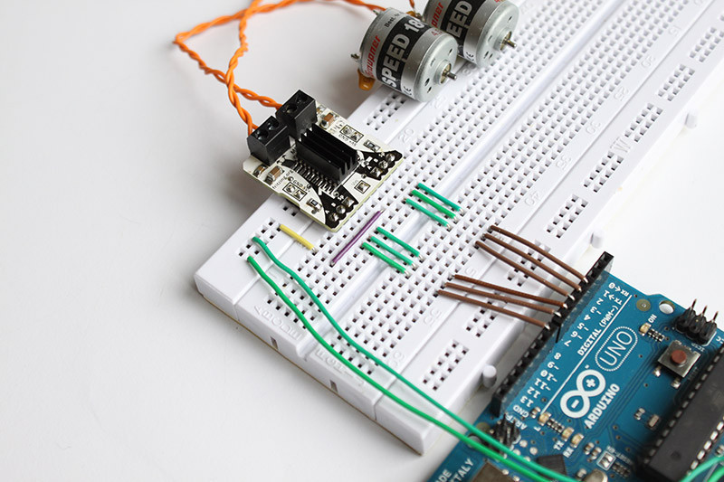 This breakout board was designed to perfectly fit on a breadboard and reduce cabling to a strict minimum. Adding motors to your project can be considered as an additional block module and no longer an engineering nightmare. We also took care of posting example projects and the necessary code to be used with Arduino to control a stepper motor or two DC motors on our projects page.