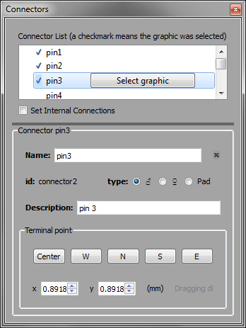 To load the SVGs for your part, switch to the appropriate view, and use File > Load image for view. As before, you can load SVGs in all views and gEDA .fp files and KICAD .mod files in PCB view only. To create an SVG for any view, you must use an external SVG editor (Inkscape, Illustrator, CorelDRAW, or a text editor) to layout the elements that will be used as connectors. The SVG example below uses <circle> elements for connectors.