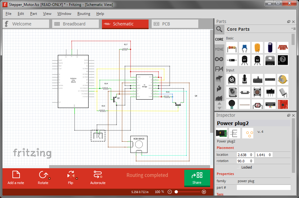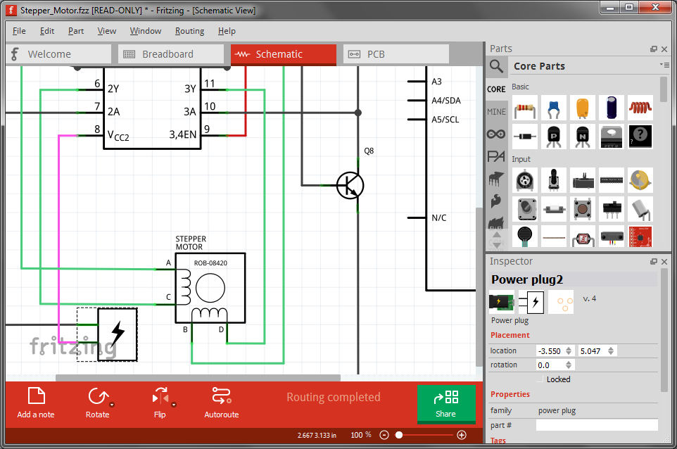 We just released Fritzing 0.8.6. Aside from some bug fixes and a few new features, it mostly addresses schematic view. To display the changes, here are two images of the stepper motor example. The first is from 0.8.5 and the second is from 0.8.6. They are both zoomed to 100%.