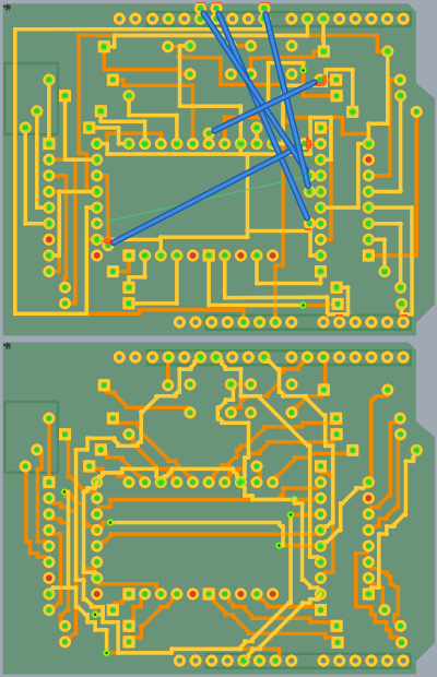 - First, as before, it will try to route everything on the bottom layer, and it will mark each failed connection with a blue jumper wire.