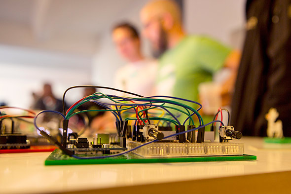 The conference was initiated and organised by our ever-enthusiastic friends Anton Mezhiborskiy from TINKER SOUP and Stefan Canditt from FORMULOR. Great job, guys! Talks on prototyping, wearables, materials, playing, and sensing gave the right inputs and visitors could join workshops such as lasercutting with vvvv, soft circuits, playing with CUBELETS or – of course – Fritzing.