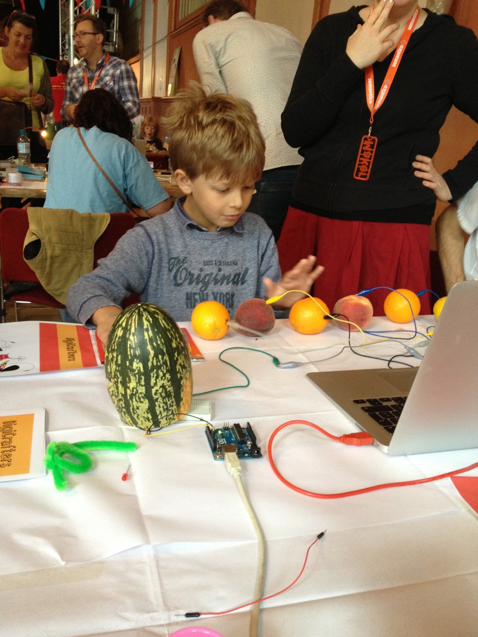 Natürlich fand man auch high end Roboter, die- anhand eines komplizierten Algorithmus das Verhalten von Bakterien eindrucksvoll imitierten oder auch ein Geschwader von Unterwasserrobotern, welche die Horden von Kindern belustigen. Die Maker Fair Brighton stand ganz im Zeichen der Familie. Eltern mit Technik-verrückten Kids belagerten die Mitmach-Stationen und Bastelecken der Projektgruppen. Gegen 14 Uhr war die Halle überfüllt mit Besuchern, die an Gummibärchencontrollern, elektrischen Bananenpianos und Lötstationen die Self-Made Futures erprobten.