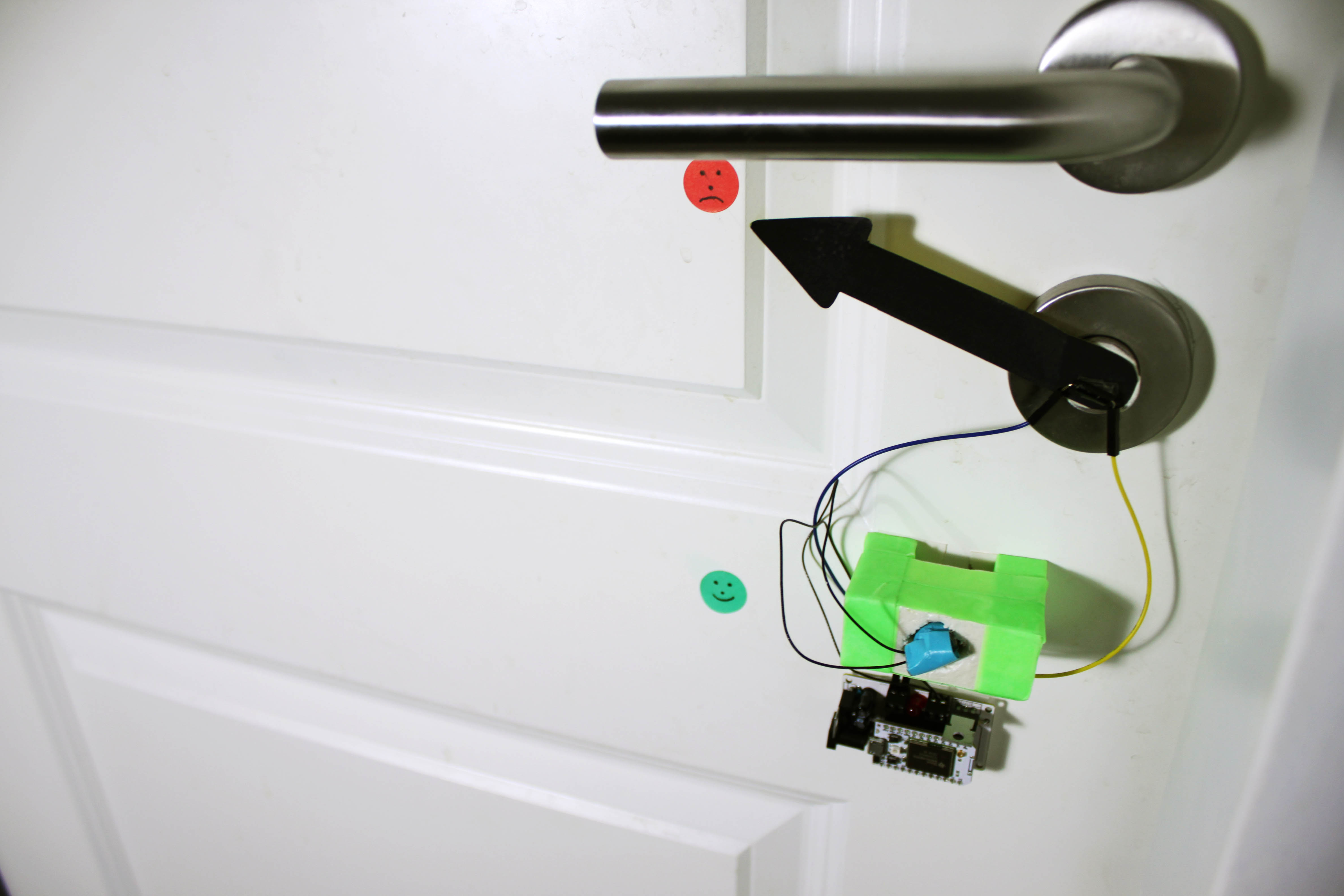 Attach the tilt sensor to the shield where it says lock and the motor where it says knock. Then just get creative and build something to hold the motor in place to knock at the door; we used a styrofoam block for it, made a hole for the motor and just taped it to the door.